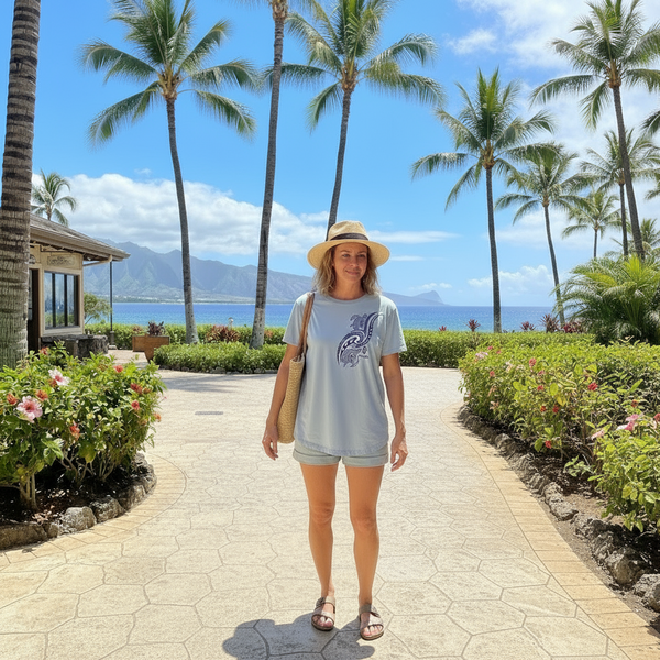 The Turtle, or Honu, holds deep significance in Hawaiian culture, symbolizing long life and prosperity. This women's 2 Honu Tribal crew neck t-shirt features our newest design screen printed on the front and the 808 logo and Hawaiian Islands printed on the back of the shirt. True to women's size, it combines style with cultural richness. The crew neck design adds a fashionable touch, and the shirt is crafted from 100% cotton for a comfortable fit. Featuring original art from a local Maui artist, this shirt is not just a piece of clothing but a wearable piece of Hawaiian art.